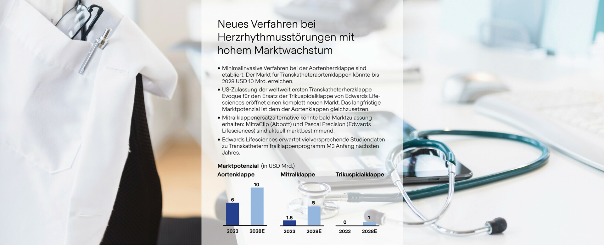 Ohne technische Geräte und Unterstützung ist Medizin heute undenkbar. Die moderne Medizintechnik verbessert sowohl die Diagnostik und Therapie, als auch die Pflege und Rehabilitation der Patienten. Das sorgt für mehr Lebensqualität bei Betroffenen, aber auch für Effizienz und Kostensenkung im gesamten Gesundheitswesen. Für diesen Sektor spricht zudem das grosse Wertsteigerungspotenzial bei Gesundheitsdienstleistern, das wachsende Behandlungsvolumen, der Trend zu Digitalisierung und KI sowie solide Prämien bei den Krankenversicherern.